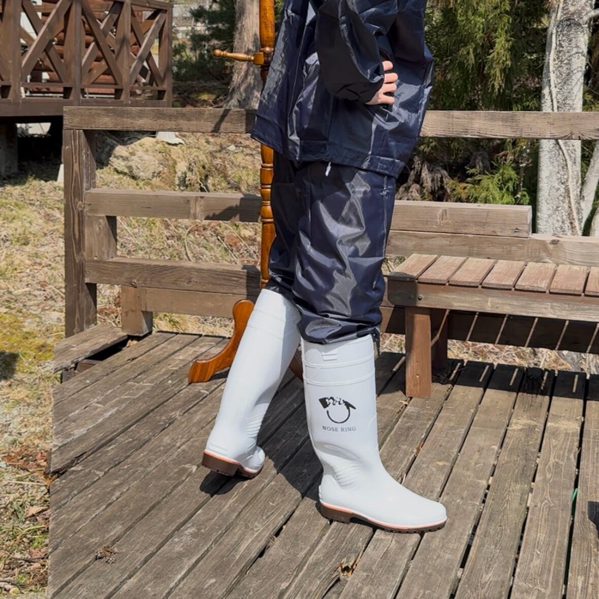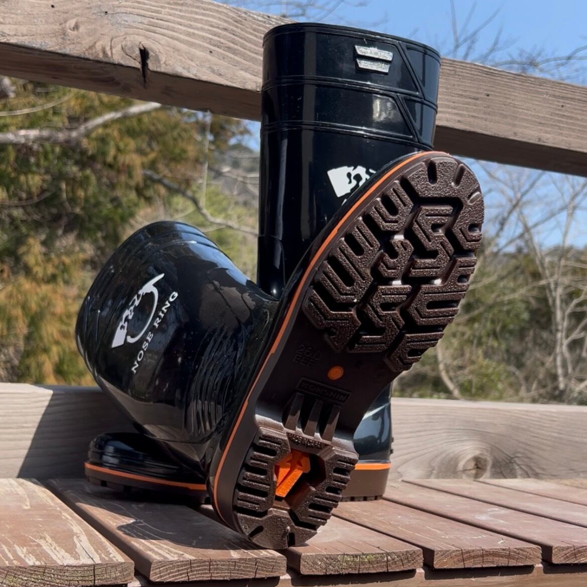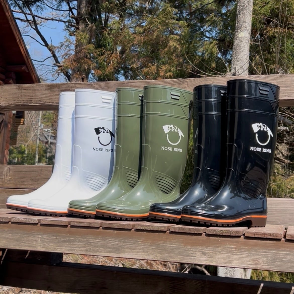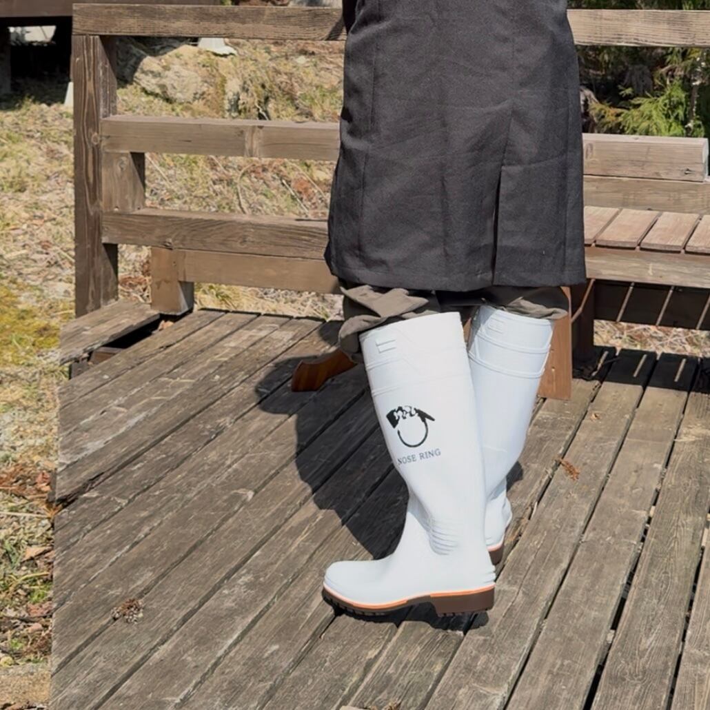 NOSE RINGロゴをプリントした畜産用長靴です。